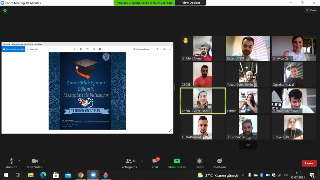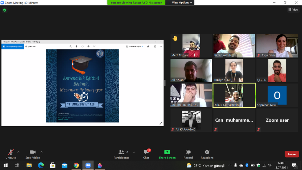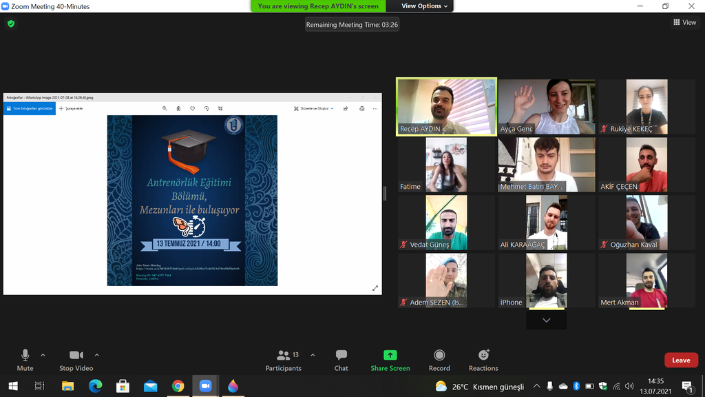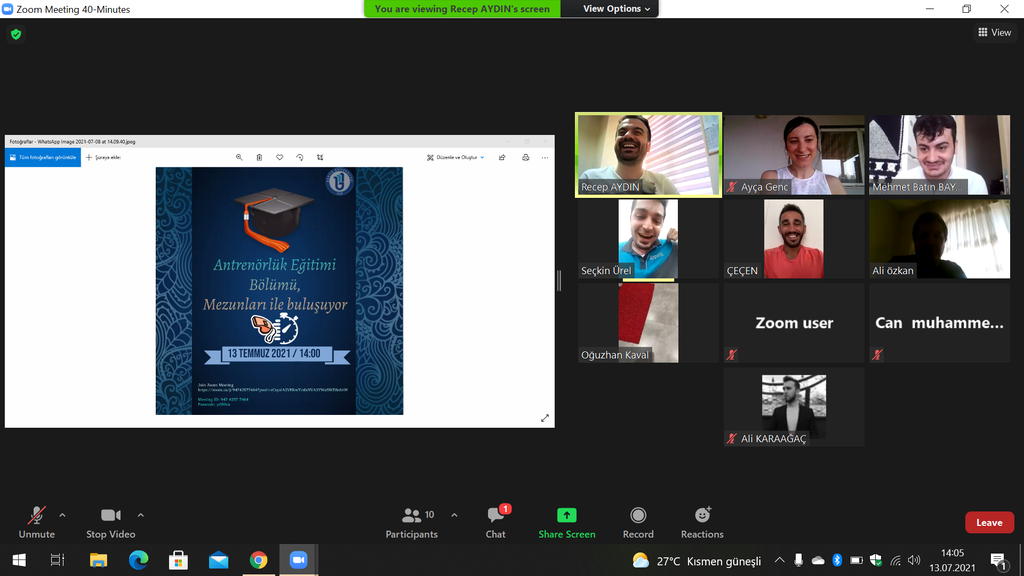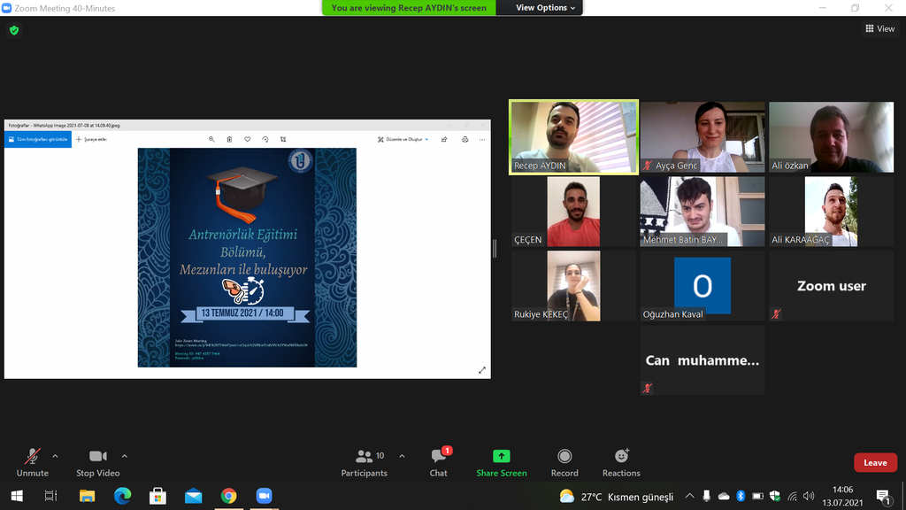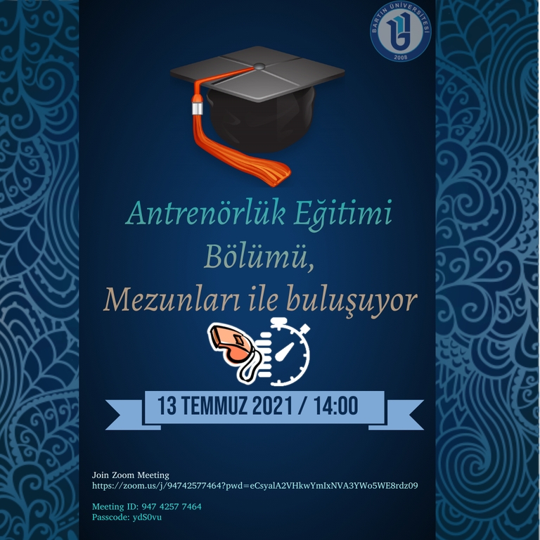 Antrenörlük Eğitimi Bölümü'müz mezunları ile iletişimimizi güçlendirmek amacıyla planlanan etkinlikler kapsamında 13 Temmuz 2021 tarihinde Saat: 14:00'da 1.si yapılan buluşmamız online (ZOOM) üzerinden gerçekleştirilmiştir.