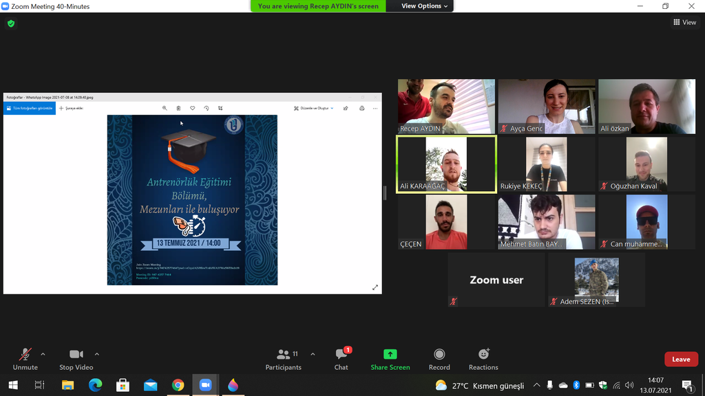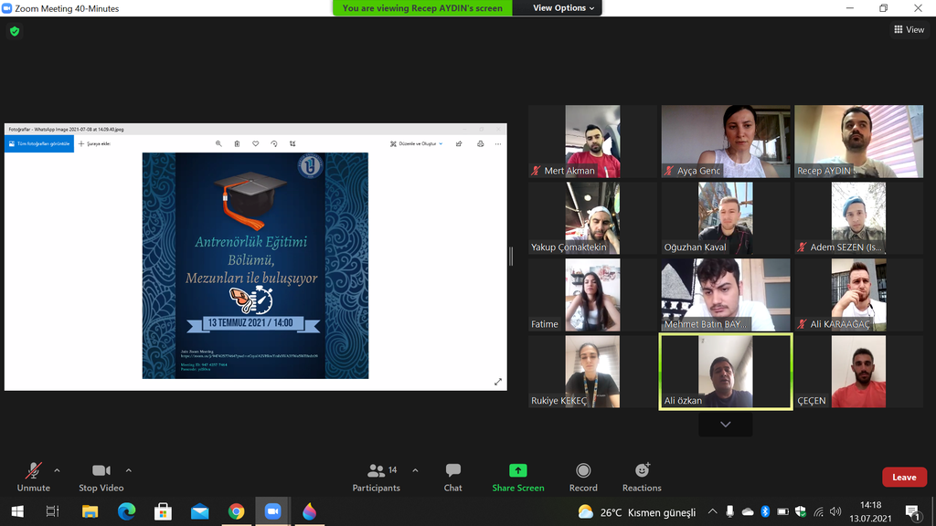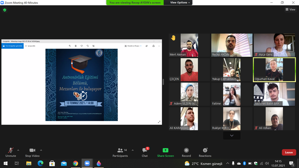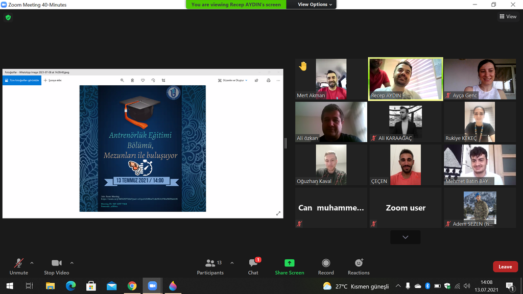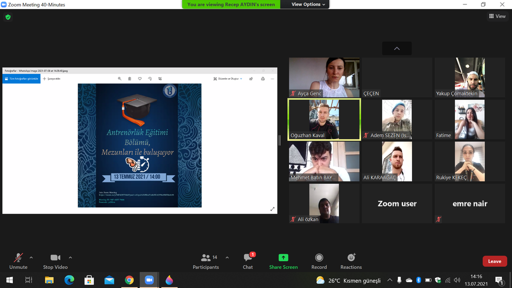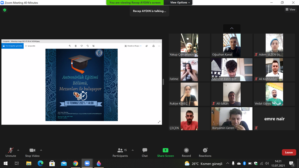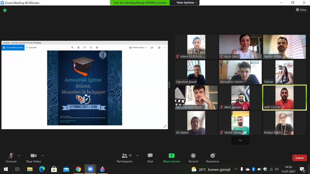 Antrenörlük Eğitimi Bölümü'müz mezunları ile iletişimimizi güçlendirmek amacıyla planlanan etkinlikler kapsamında 13 Temmuz 2021 tarihinde Saat: 14:00'da 1.si yapılan buluşmamız online (ZOOM) üzerinden gerçekleştirilmiştir.
