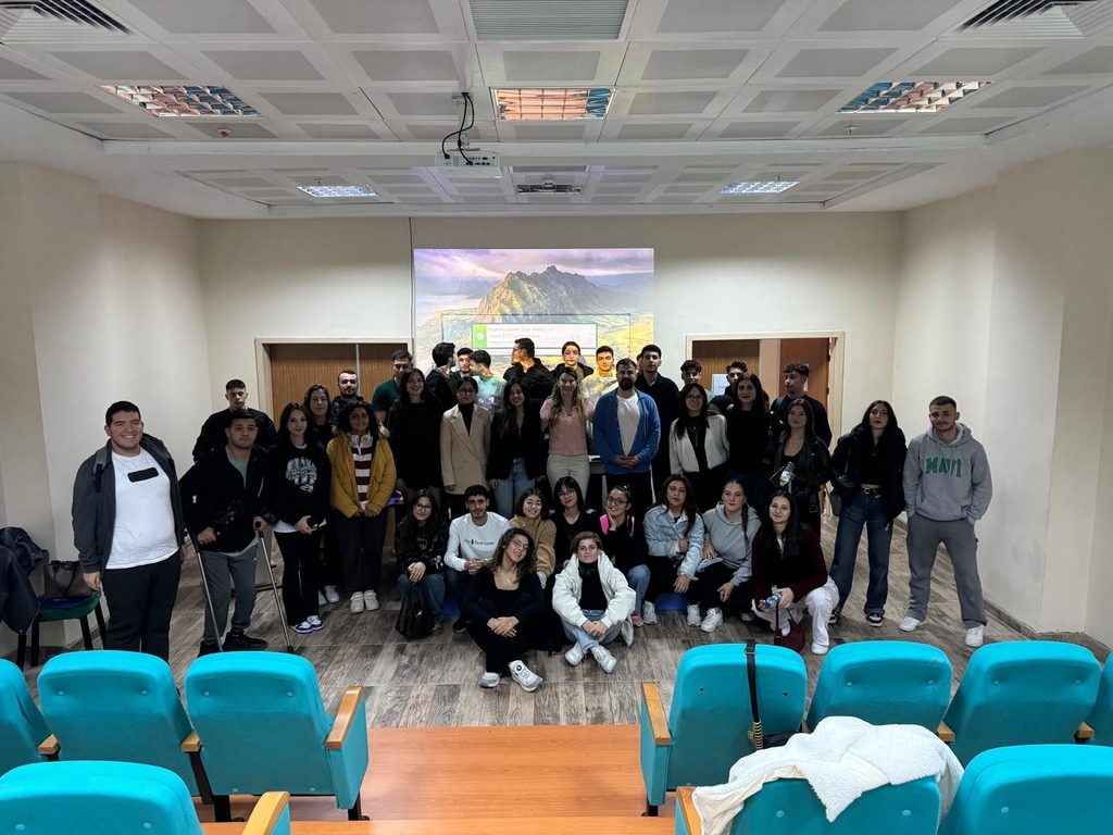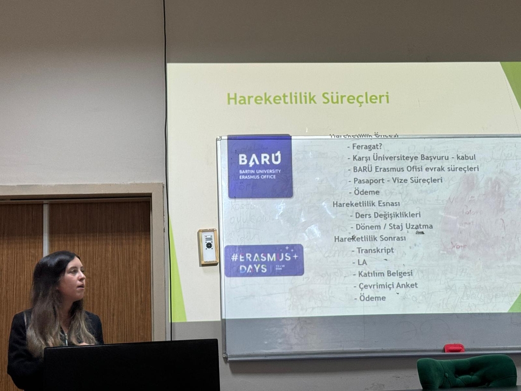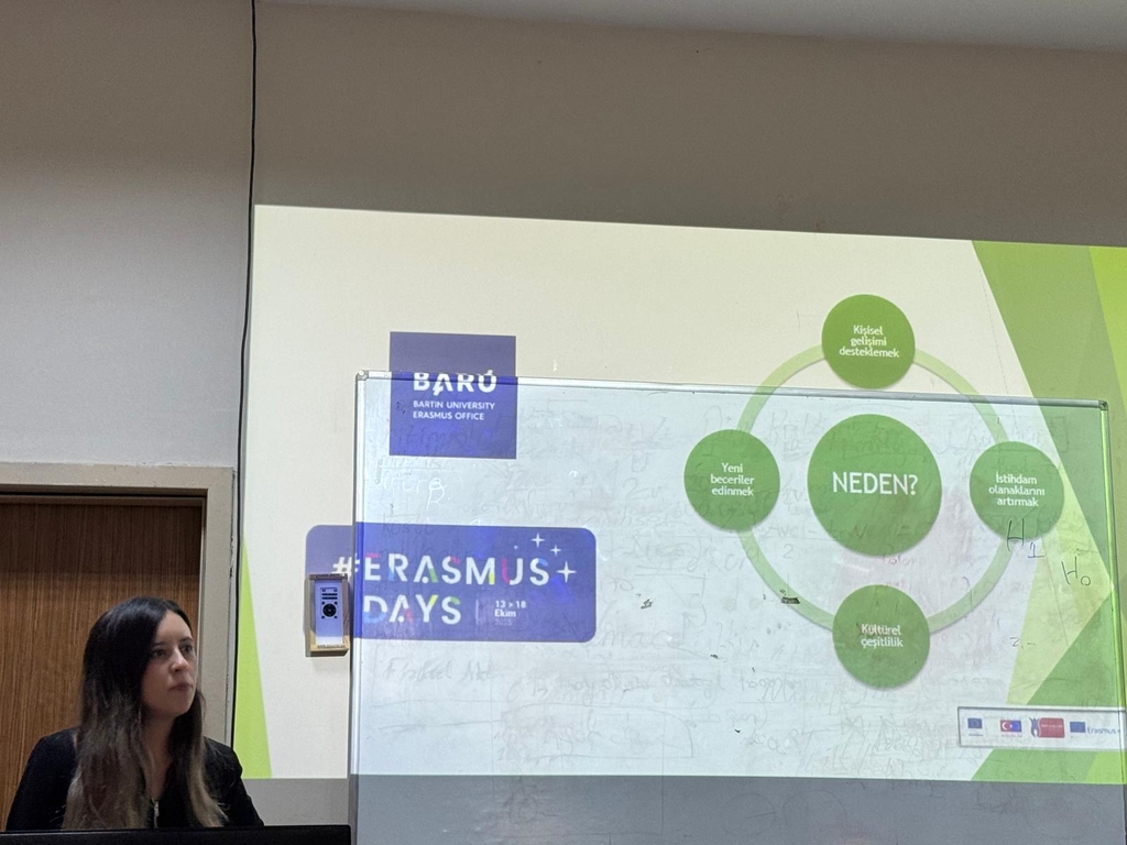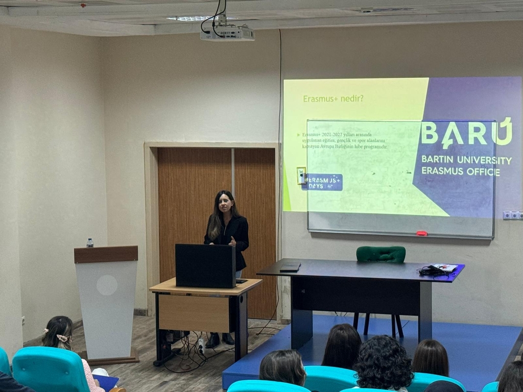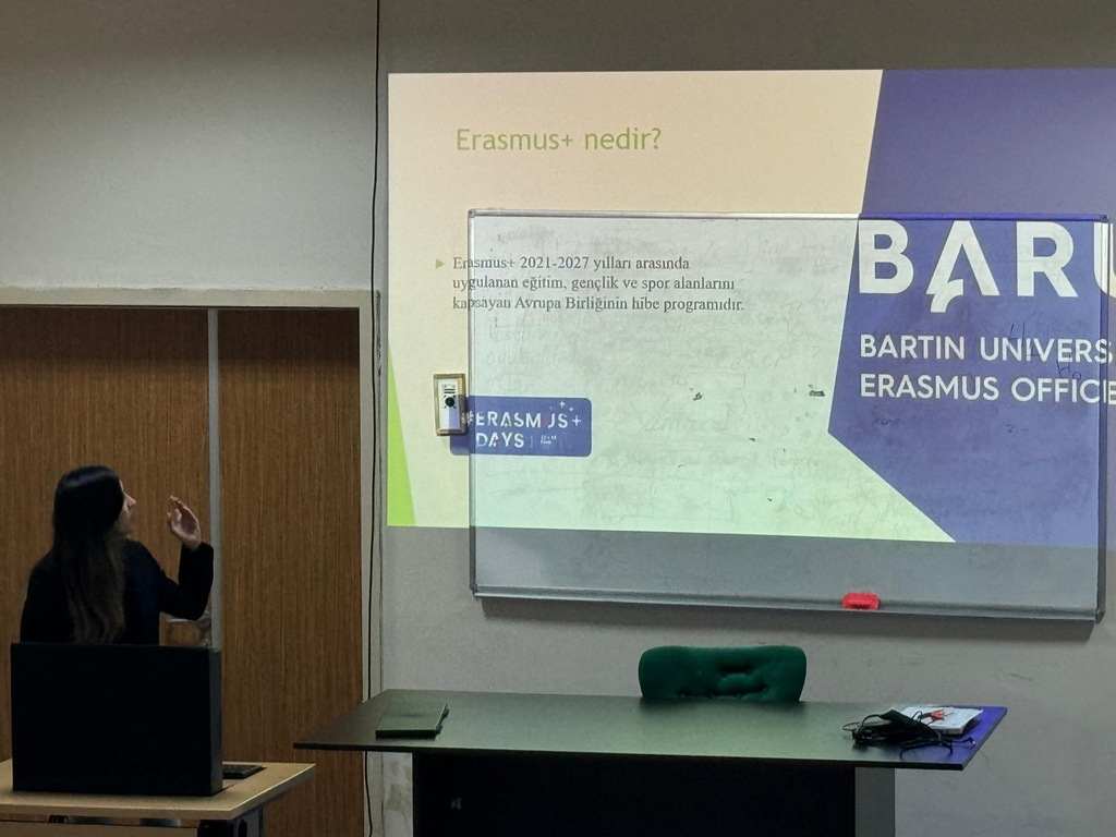 Erasmus+ programı hakkında sunum yapılan toplantıda, başvuru süreci, gerekli belgeler, seçim kriterleri, hibe olanakları ve gidilebilecek üniversiteler hakkında detaylı bilgi verildi.