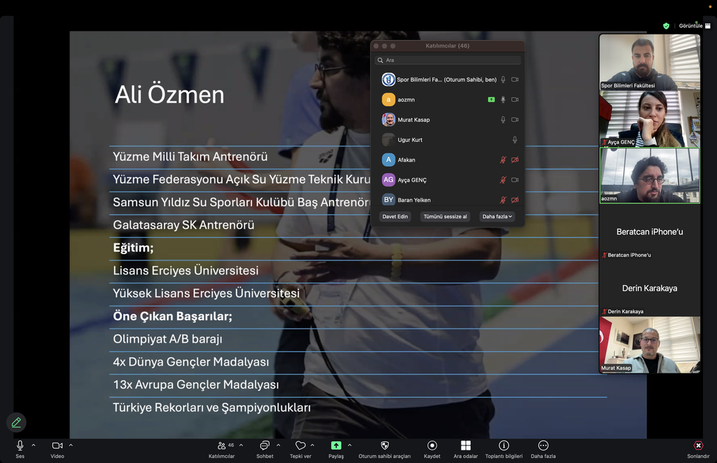 Özmen, konuşmasında milli takım düzeyinde antrenörlük deneyimlerini, sporcuların uluslararası başarıya ulaşmasında antrenörün rolünü ve yüzme antrenörlüğünün günümüzdeki gelişimini katılımcılarla paylaştı. Söyleşiye antrenörlük eğitimi bölümü öğrenci ve mezunlarımız yoğun ilgi gösterdi.