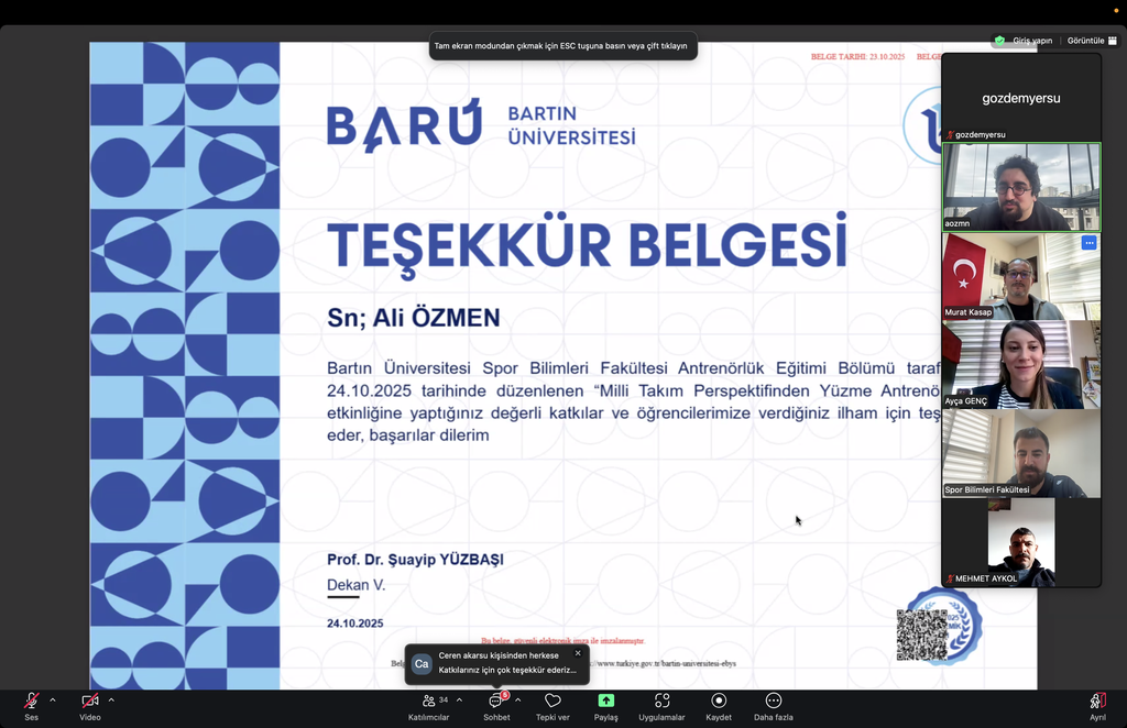 Bartın Üniversitesi Spor Bilimleri Fakültesi Antrenörlük Eğitimi Bölümü tarafından düzenlenen “Milli Takım Perspektifinden Yüzme Antrenörlüğü” adlı çevrim içi söyleşi 24 Ekim 2025 tarihinde gerçekleştirildi.